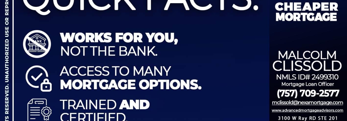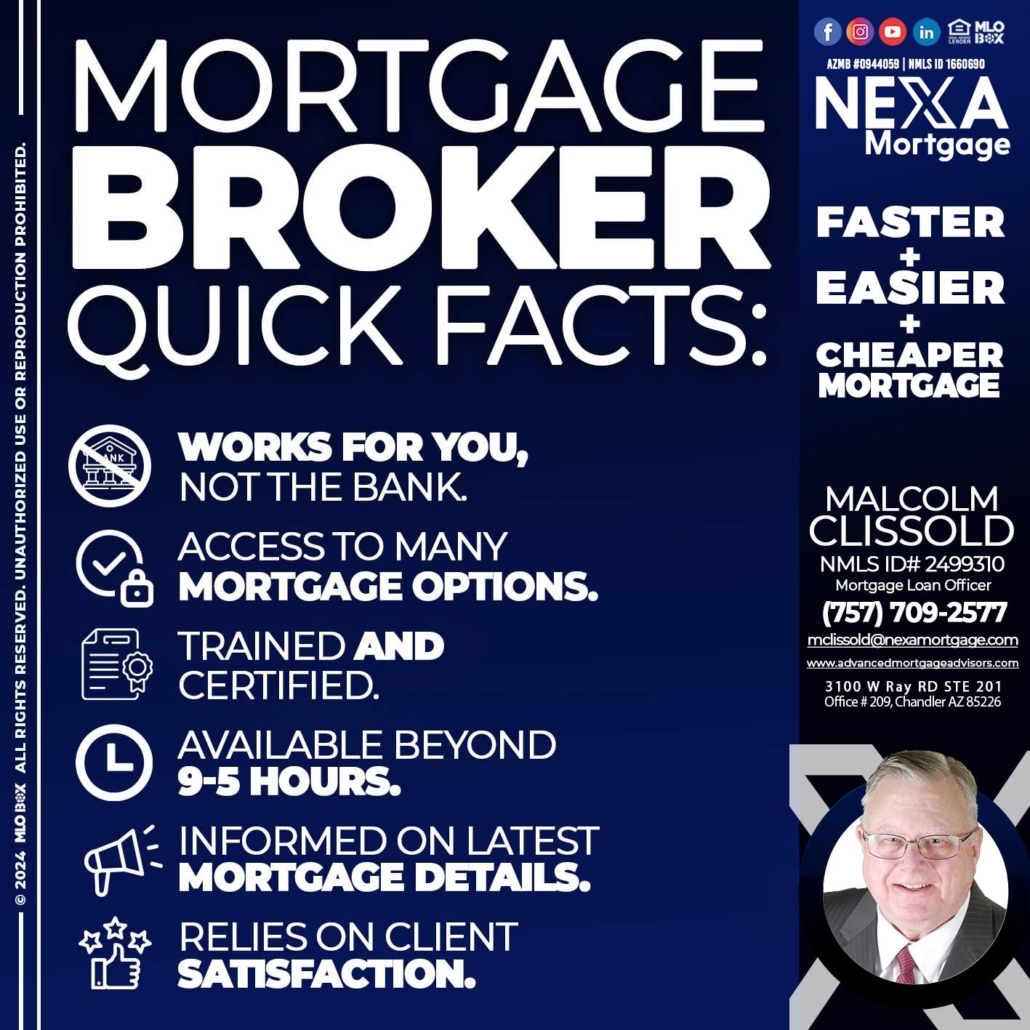 Hi, my name is Malcolm Clissold. I’m a Loan Officer with NEXA Mortgage, offering personalized mortgage solutions, fast customized quotes, great rates and service with integrity.